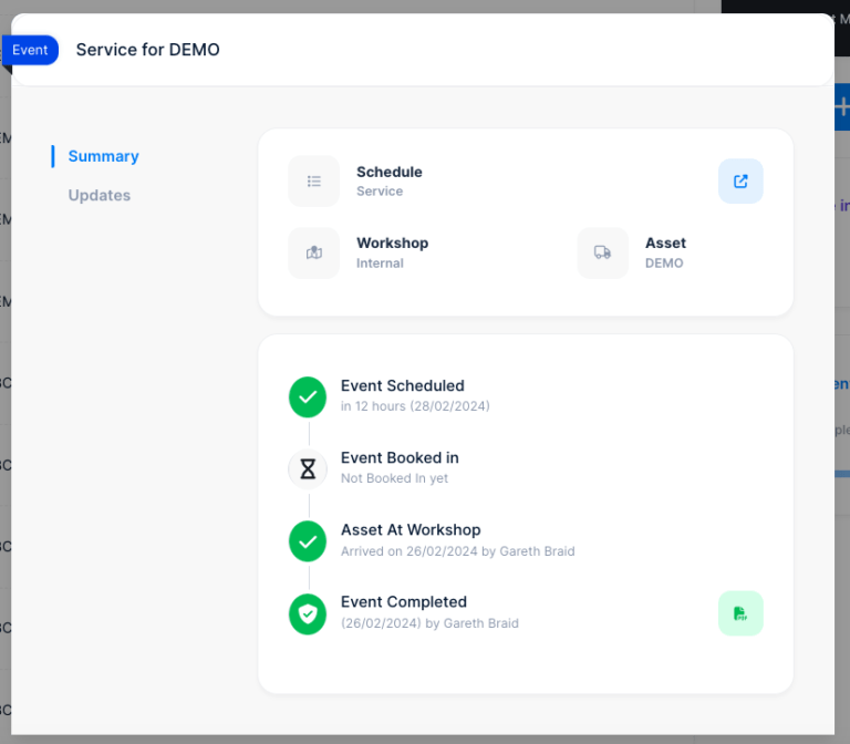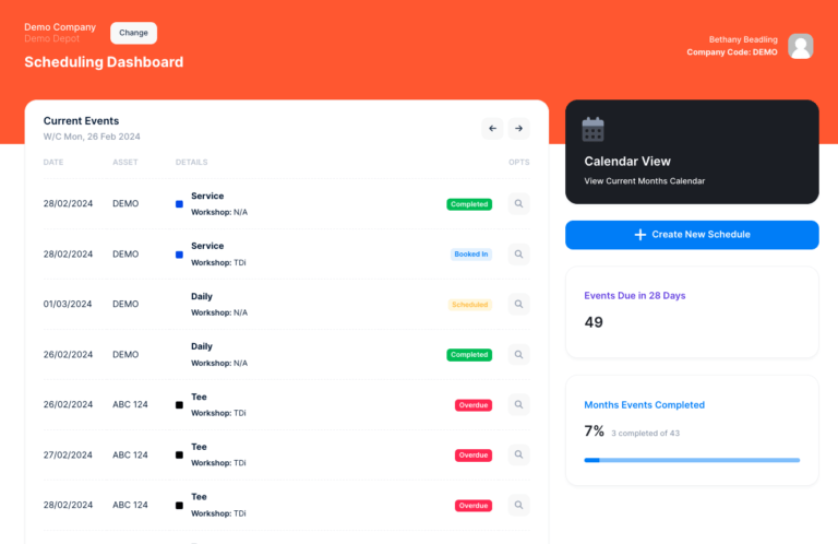 View scheduled events, see what’s already been completed, and what asset has been booked in.